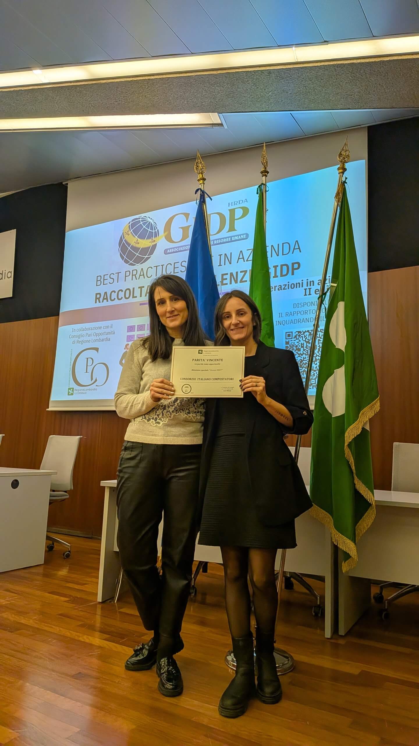 Alla cerimonia erano presenti Vera Brambilla, responsabile del Sistema di Gestione per la Parità di Genere aziendale, e Alessandra Porro del Centro Studi CIC.